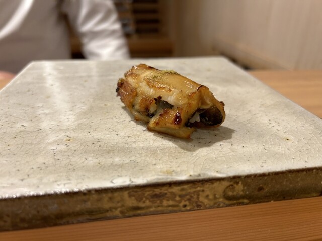 黒鮑の肝ソース、コノワタと続き握り開始。