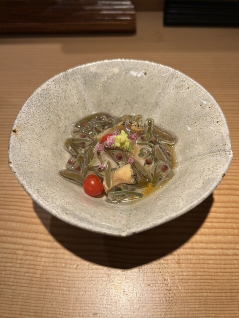 牡丹海老の紹興酒漬、ジュンサイ、ニタリクジラの尾の身と続き鰹の藁焼き。