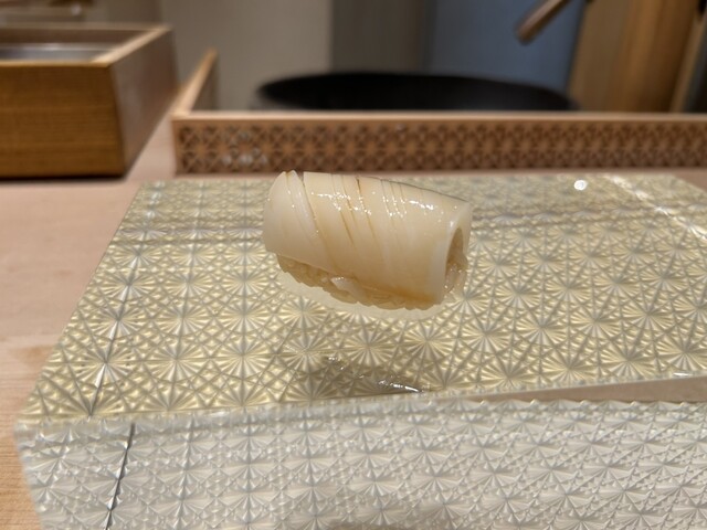 シャリを覆うようにのせられたスミイカは、厚めに切られ包丁が斜めに細かく入っています。