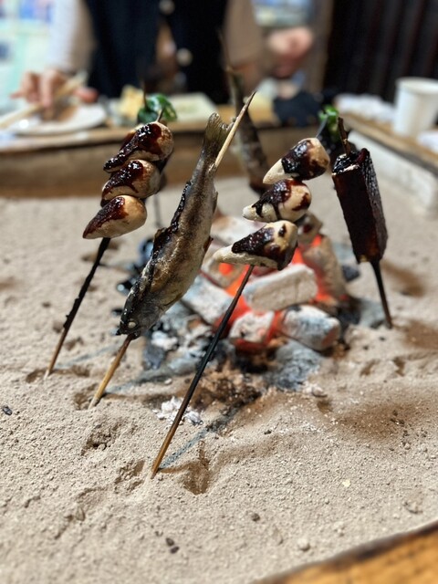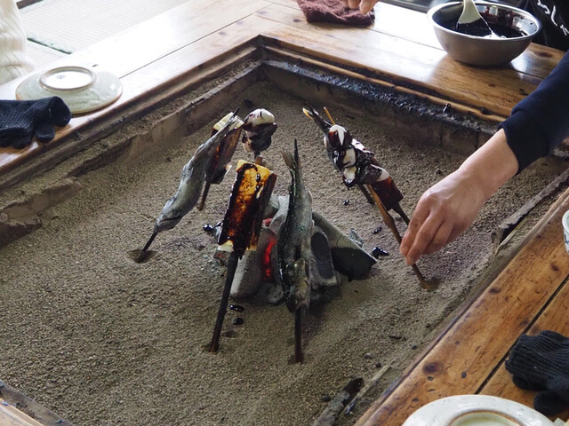 囲炉裏の砂ぬ刺した串は、頃合いを見ながら