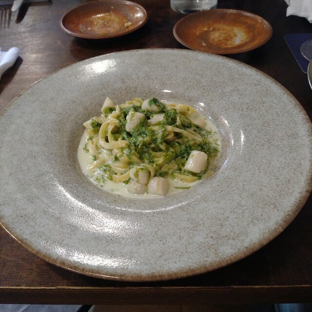 前菜(揚げたっぽいきのこが甘くないクレームブリュレに刺さってる 語彙笑)たまごと混ぜながらのトマトの熱々スープ、わたし大好きな柚子胡椒と小柱のクリームパスタ…手打ちのたぶんタリアテッレ、とろとろ牛タンととうもろこしのクリームみたいなやつ(なんだっけあれ、ポなんとか)と、小さいデザート、ほら、卵白つかったラデュレとかで高く売ってる丸いお菓子なんだっけ…最近固有名詞がまったく出てこない。全部美味しい。3800円は安くないですか。もう晩ごはんはお茶漬けだよ…
