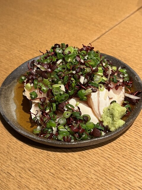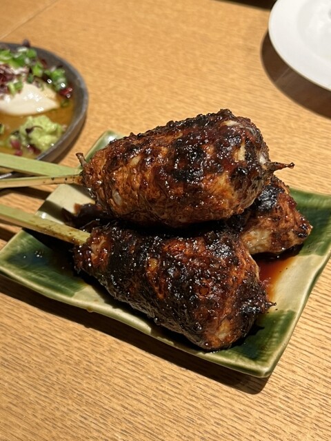 とりわさ、せり、つくね、百合根の天ぷら。