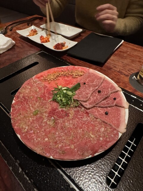 今日はコースで。とは言っても、このお店でコースを頼んでも、プラスで当たり前に付いてくる。本当にいつもありがとうございます。女子はお腹パンパン。今回1名女子がいたけど、痩せの大食いで沢山食べてくれた。焼き物の前に来たユッケで既にモリモリに気持ちが。。タンの食べ比べと極上ロースが出てきたあたりで気持ちはお腹いっぱい。