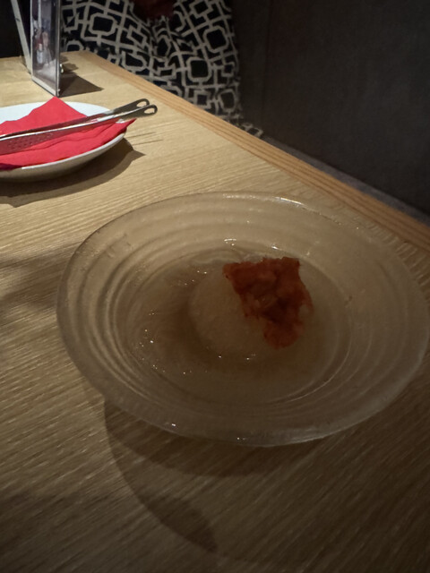 お肉は何を頼んでも柔らかくて美味しかった。焼かない黒毛和牛生ハンバーグが意外とハマったらしい。大葉が美味しい連呼していた。タンも、kintan言うくらいだから、塩加減が絶妙で歯ごたえも良かった。個人的にここのフィレ肉はめちゃくちゃ美味しいと思う。柔らかくて塩加減が調度良い。ここのお店はどの店舗も2つのタレが卓上にあるけど、お肉にしっかりと味付けしてるから、タレは使った事がない。今回ほぼ初使用。甘みが増すからこれはこれで良いのかもって、特にカメノコを食べていた時に思った。あぁ、美味い。。。そして、何度も頼んでいるけど、フォアグラとトリュフの石焼きビビンバに入っている浅漬けのようなものが、遅れてすみませんがアクセントとして最強なことに気付いた。