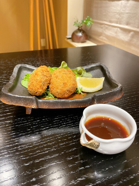 和牛メンチカツもジューシーでカラッとあがっていて絶品。自家製のソースがフルーティで、かけるとより美味しくいただける魔法のソース。