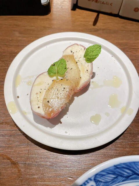 一つからオーダーできる白桃の生ハム包み、甘い桃をクリームチーズと塩気のある生ハムで包んだ名品。