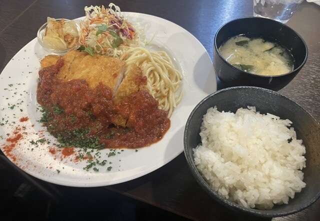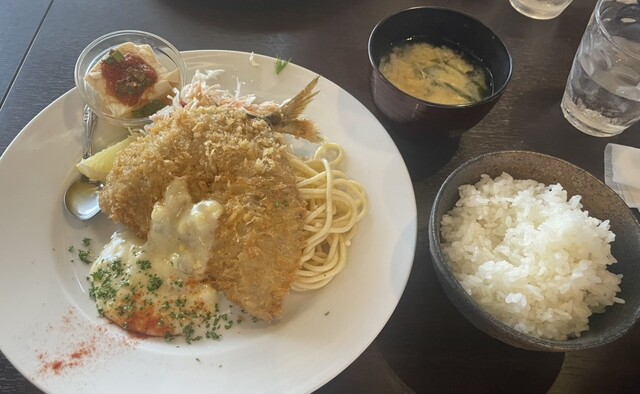 衣はサクッと軽く、豚肉はしっとり柔らか。トマトの酸味とバジルの香りが効いたソースがカツの旨みを引き立て、ご飯が進みます。同行者が注文したエビフライも美味しそうでした。