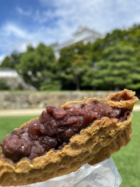 流石に城内で食べるのは、はばかられる(笑)入城ゲートより手前でいただきました。皮、薄い〜♪