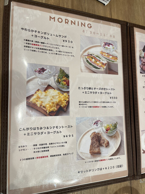 モーニングはおすすめのやわらかチキンボリュームサンド+ヨーグルトとこんがりはちみつ&シナモントースト+ミニサラダ+ヨーグルトを注文。