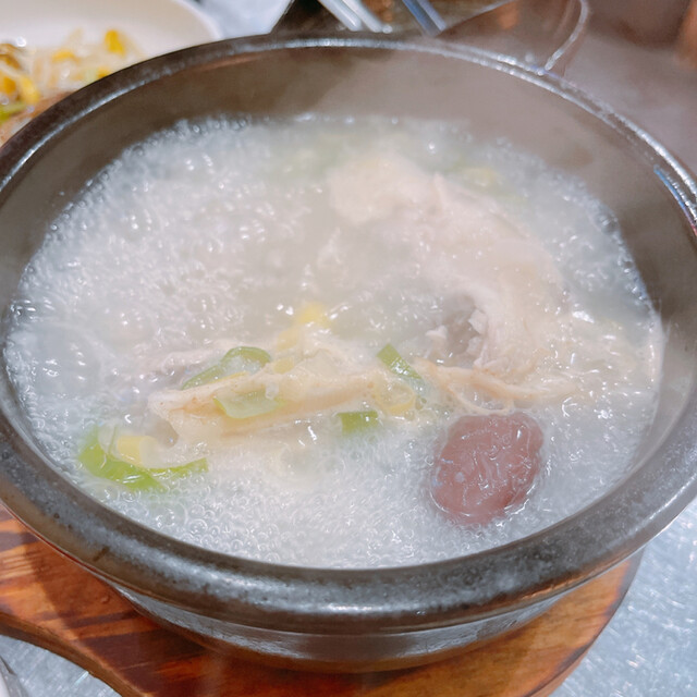 海鮮チヂミはちくわ、キャベツ、にんじん、ネギ、えび、いか、が入っていてもちもち、ちこちこ、ふんわり、カリッです。参鶏湯はクツクツ地獄谷の様に湧き上がって登場。
