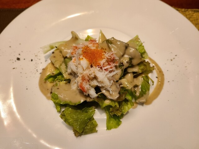 続いてはカニ身とカニ味噌を使ったドレッシングのサラダ。