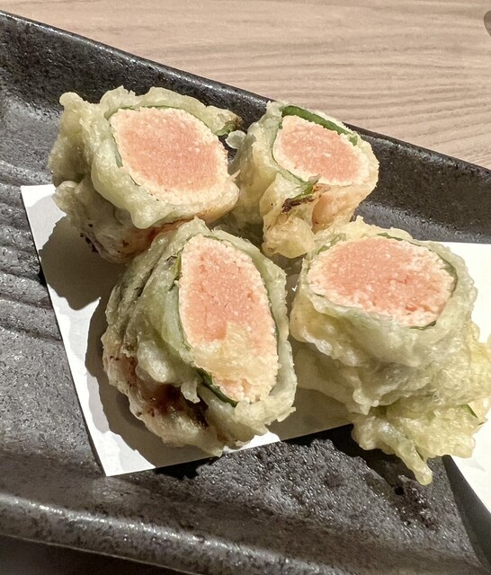 ほたての甘さに濃厚な雲丹が合わさると、ひと口なのに“ご褒美感”がとんでもない。明太子は大葉で巻かれていて、風味がふわっと広がる上品な仕上がり。どれも工夫があって、ただの天ぷらではなく“つまみとして楽しい”ラインナップ。
