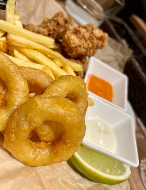 揚げたてのオニオンリングとフレンチフライはスペインというよりアメリカンな味わい。ビールによく合う。