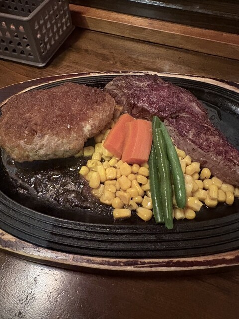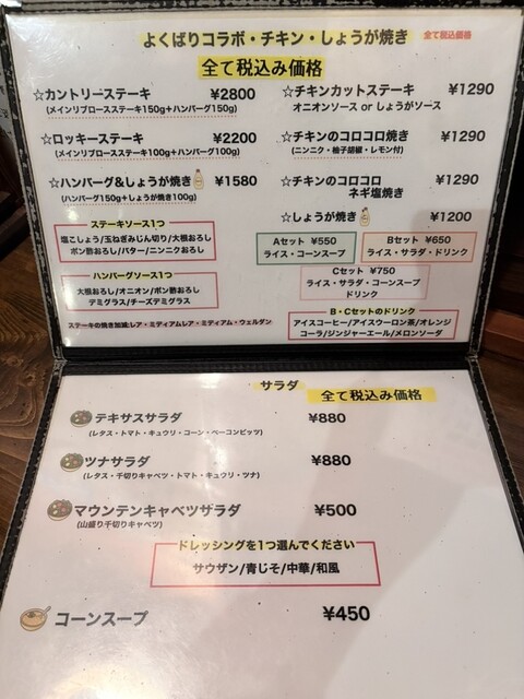 カントリーステーキ(リブロースステーキ150gとハンバーグ150g)とBセット(ライスとサラダ)、タコスを注文。