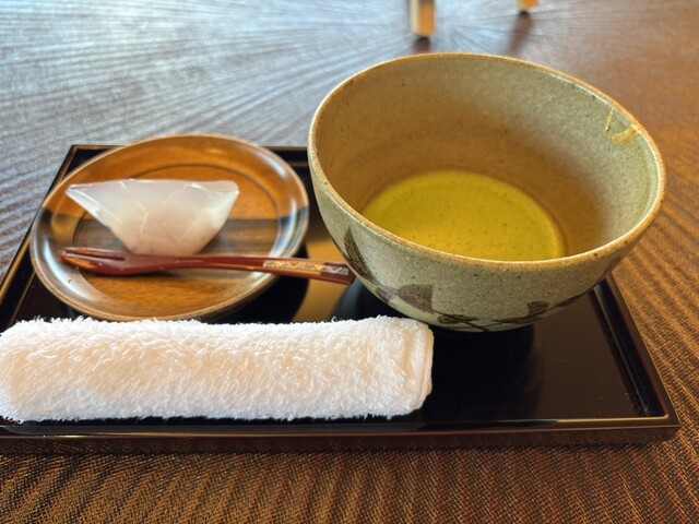 写真は、お夕食と旅館に着いてすぐに出してもらえるお抹茶と旅館オリジナルの葛餅のお菓子です。