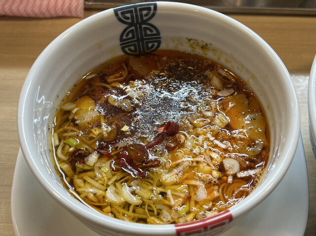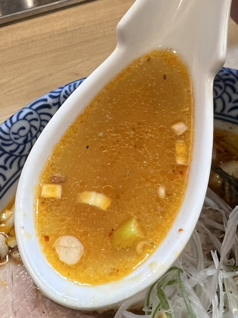 出汁は鶏や豚の動物系に魚介類と思われるものの、自ら味わう限りでは香辛料でマスキングされている為か豚が強めに出ている様に感じます。
