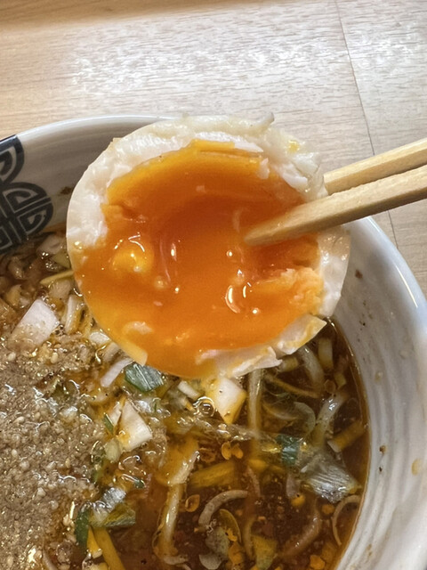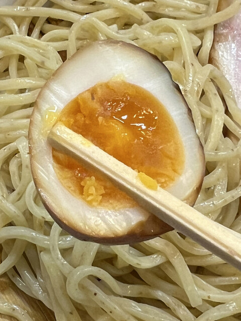 一方、味玉は箸で割ると黄身が若干流れ出す程度の固まり具合で、尚且つ味付けを極微かに留めているので黄身の濃密な旨味が舌にダイレクトに伝わります。