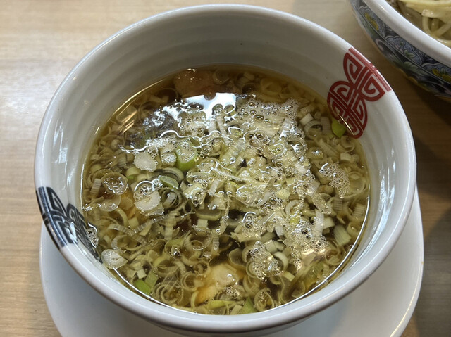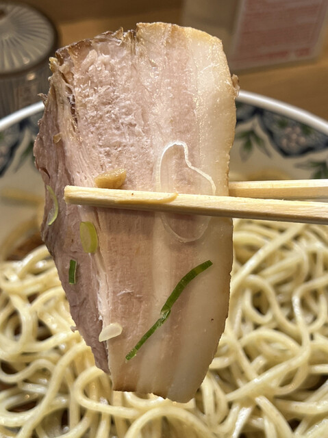麺や具材は「特製豚鴨つけそば」と同様で、琥珀色のスープには細切りチャーシュー、ネギの微塵切り、白胡麻が仕込まれています。