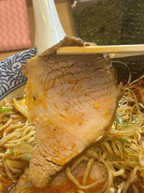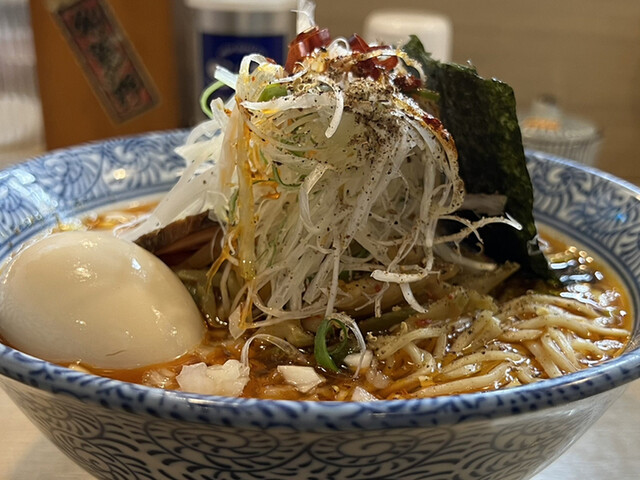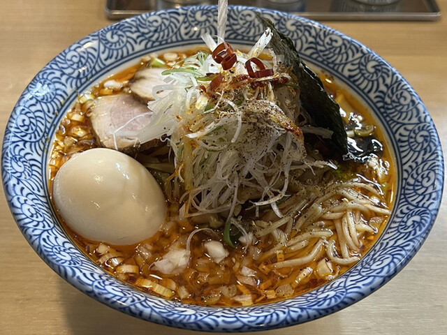スープは仄かな赤味を帯びていて、細麺の上にはチャーシュー、味玉、海苔、刻みネギや玉ネギ、山椒と鷹の爪を配った白髪ネギが乗っています。