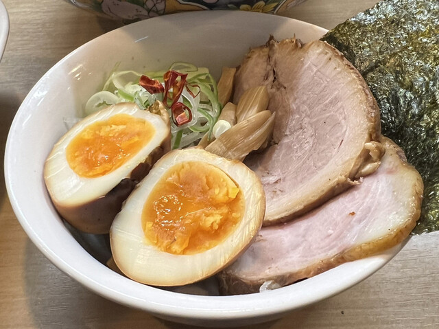 一方、チャーシューは「中華そば」と同様に豚腿肉と豚バラ肉の煮豚ですが、豚バラ肉をスープに投入すると脂が溶け出す事で味わいに一層のコクや甘味を与えます。