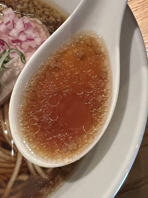 醤油と魚介節の酸味が調和する事で味わいにキレを与えていて、尚且つ溶け出た背脂のコクや甘味が加わる事で旨味の層に適度な厚みを与えています。