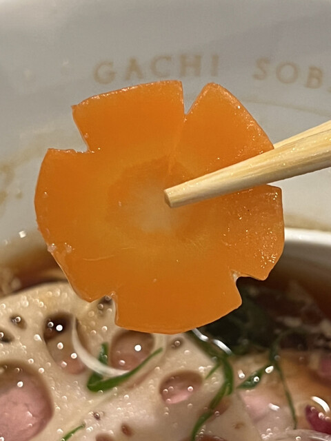 醤油スープには香味油と背脂が浮いていて、灰分リッチな中細麺の上にはチャーシュー、メンマ、薄切りの蓮根や人参、細切りのネギが乗っています。
