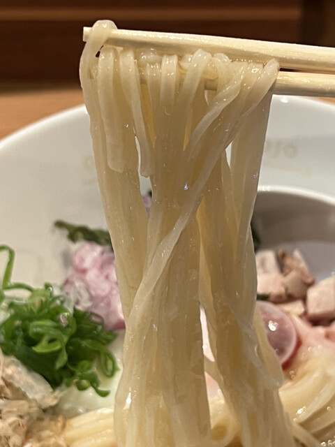多加水麺と低加水麺の良い部分だけが高い次元で両立されていて、麺打ちの達人と呼ばれる「上野信広」氏の職人技が冴え渡る芸術的な仕上がりです。
