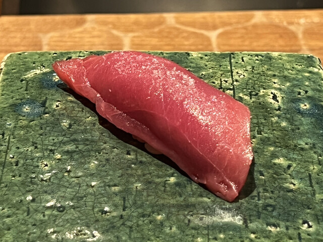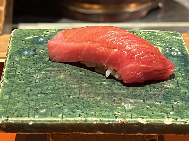 特に赤身を噛み締めるとネットリとした歯触りを感じると共に、鉄分臭を伴わない鮪の純粋な旨味が舌に極めて緻密に伝わります。