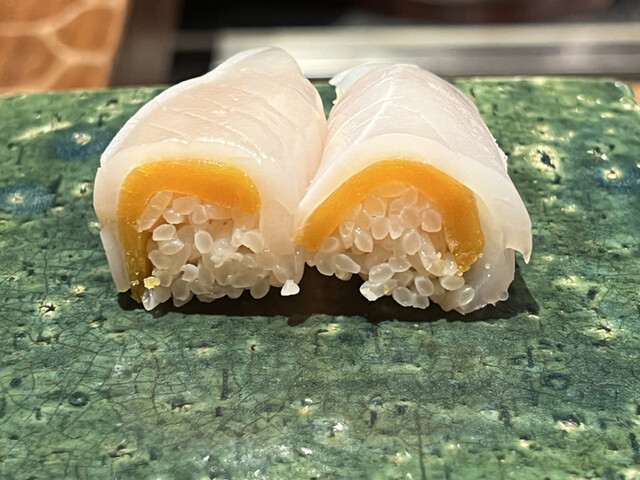 半熟に焼き上げたウニが海苔を使わず握られていて、仄かな温もりを帯びたクリーミーな身肉からはウニのコクが舌に緻密に伝わります。
