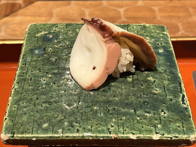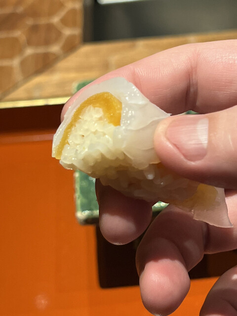イカと酢飯の間には薄切りのカラスミが挟み込まれていて、カラスミが味の主体を占めつつもイカや酢飯が塩気を巧妙に中和しています。