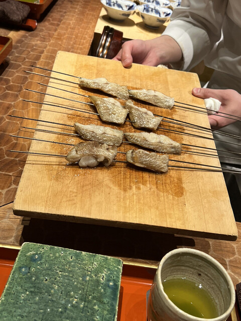 身肉は血生臭さを伴う事なく旨味が凝縮されていて、尚且つ間に仕込まれたヒモが食感に心地良いアクセントを与えます。