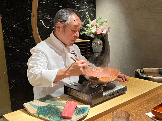 軽めに湯通しした後に煮切り醤油に1時間半ほど漬け込んだサクを切り分けて握っていました。