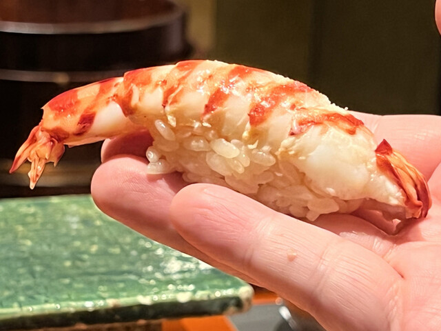 酒に漬け込んでから茹でられた車海老が握られた後に塩が塗られての提供です。