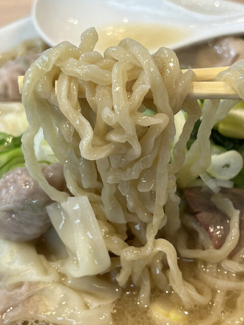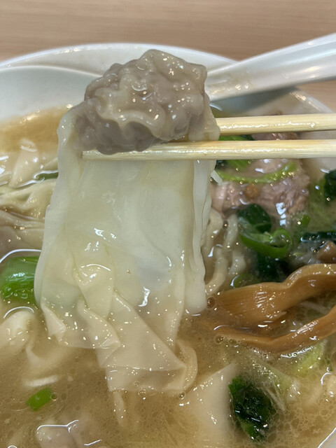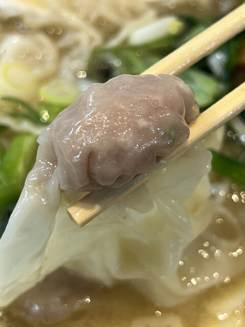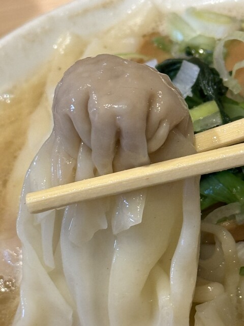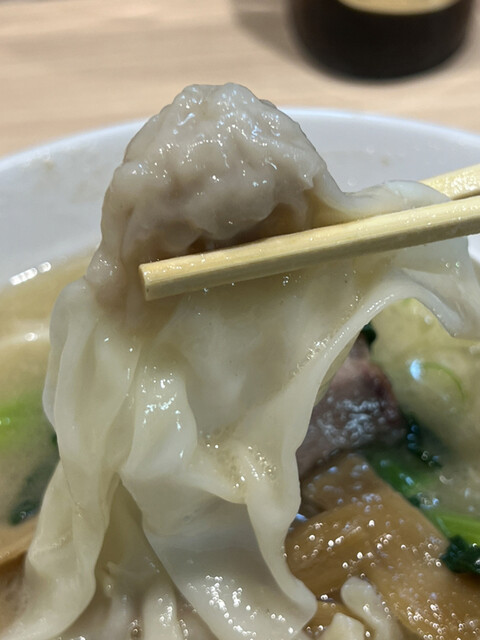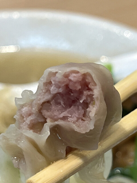 次にワンタンを食べてみると、豚挽肉を主体とした少量の餡が薄め且つ広めな皮で緻密に包み込まれています。
