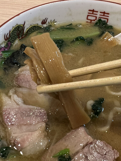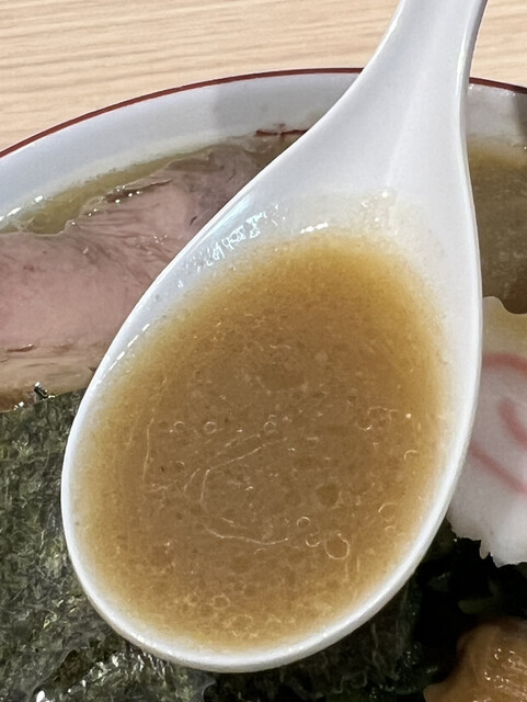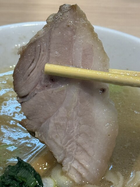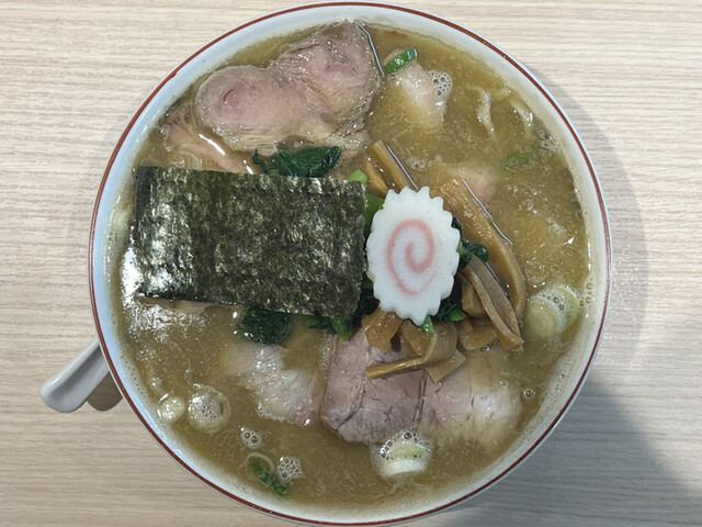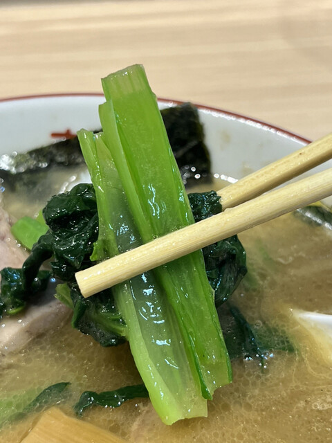 濁ったスープは仄かな醤油の色味を帯びていて、縮れた太麺の上にはチャーシュー、小松菜、ナルト、海苔、粗切りのネギが乗っています。