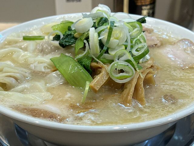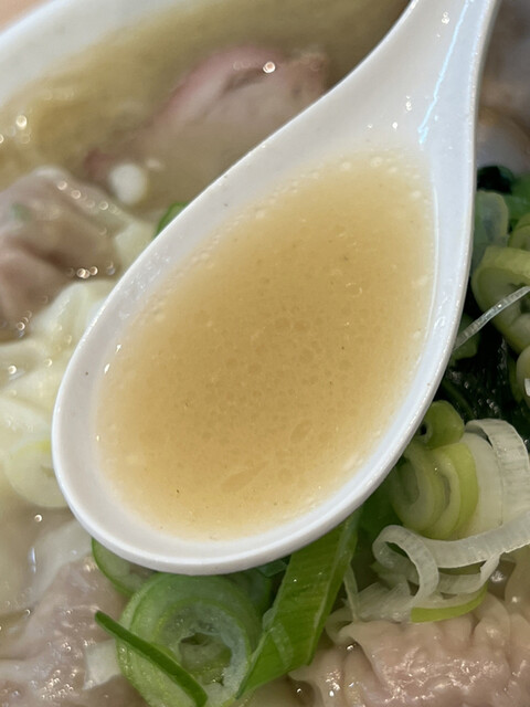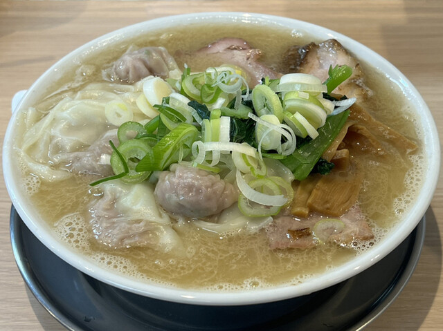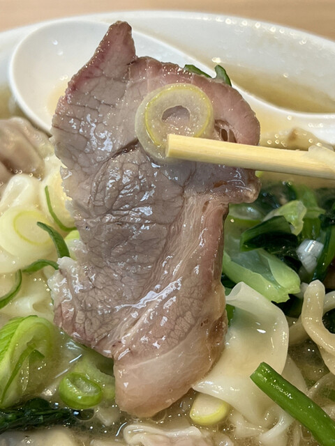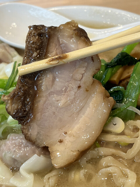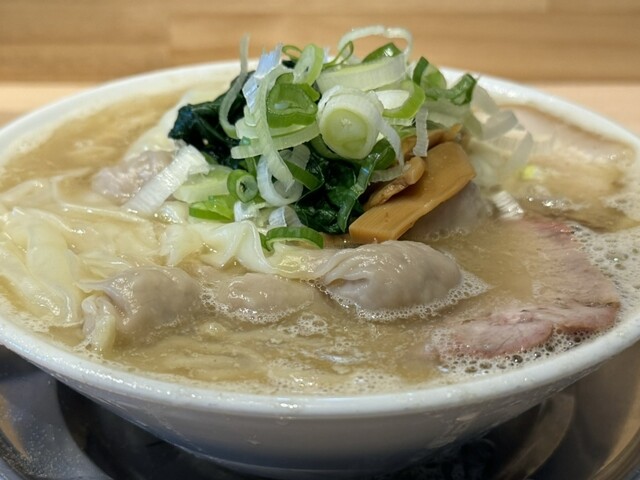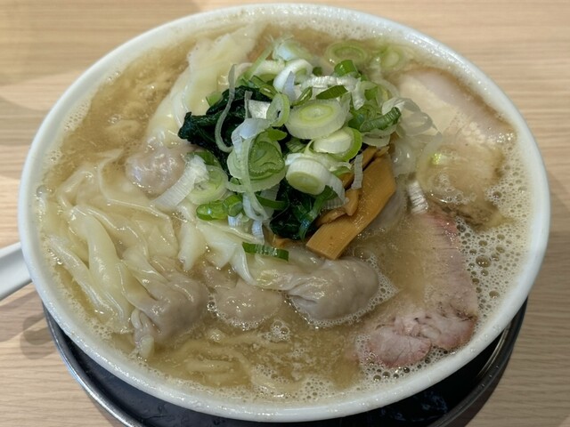 スープは清湯と白湯の中間的な濁り具合で、縮れた中太麺の上にはチャーシュー、ワンタン、メンマ、ホウレン草、刻みネギが乗っています。