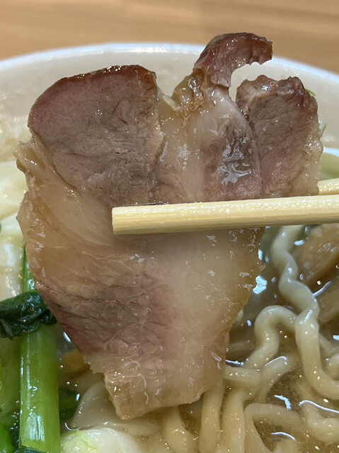 次にチャーシューを食べてみると、吊るし焼きで仕上げられた豚腿肉や豚肩ロースと共に豚バラ肉の焼豚が不揃いな厚みに切られています。