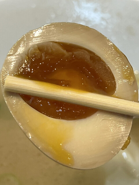 最後に味玉を食べてみると、半熟の黄身は幾分固めに仕上げられていて、甘めな醤油ダレが黄身のコクを巧みに際立てています。