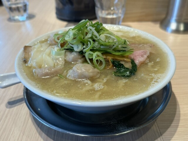 その後、定刻と共に店内に案内され、席に着いて「ワンタンメン(塩)」の食券を渡すと待つ事6分ほどでラーメンが到着です。