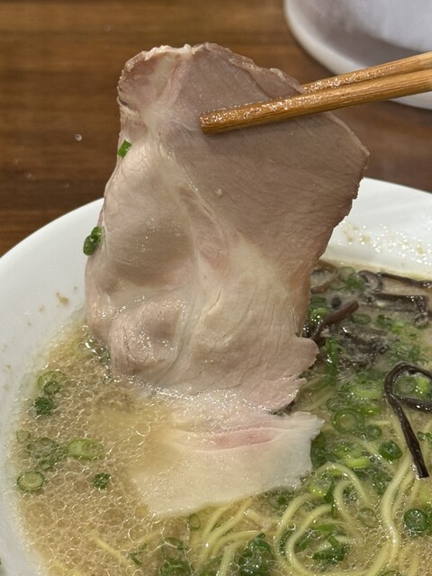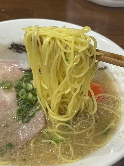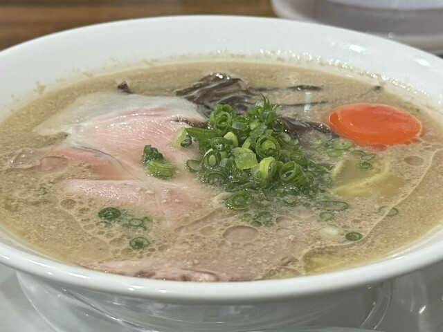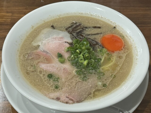 薄ら濁りを帯びた豚骨スープには分厚い油膜が浮いていて、極細麺の上にはチャーシュー、キクラゲ、刻みネギ、卵黄が乗っています。