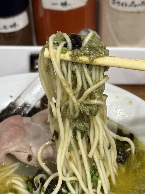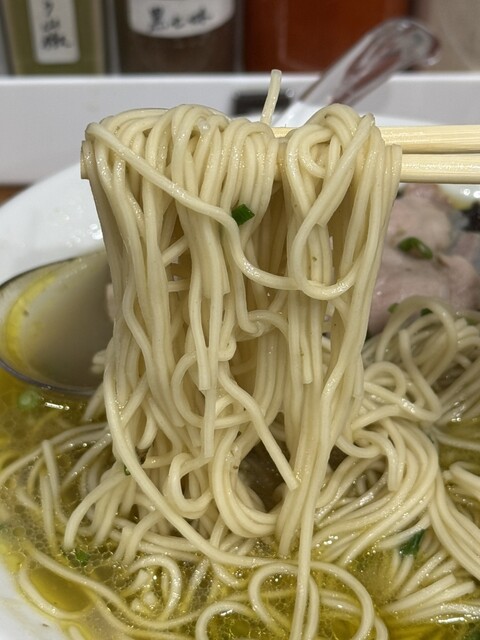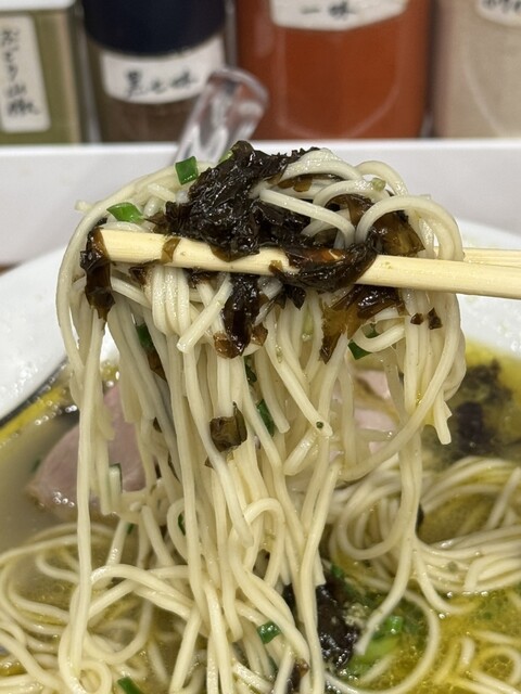 次に麺を食べてみると、低加水寄りの極細麺が適度な硬さに茹でられていて、ムッチリとした弾力と共に鮮明な小麦の風味を感じます。