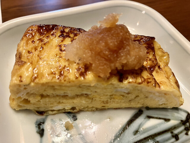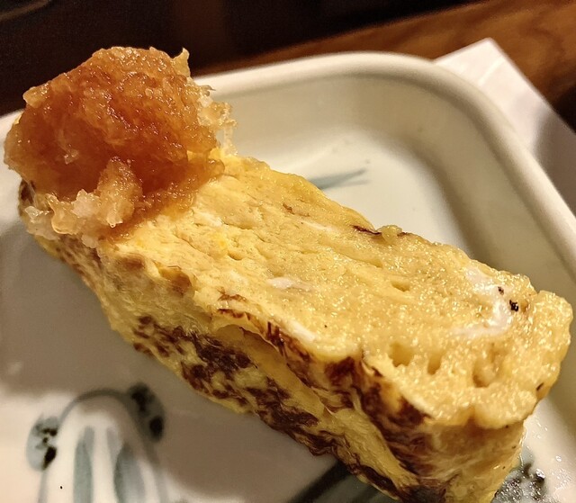 熱々の玉子焼きは、甘めの味付けに、フワトロ感がすごくて、これも美味しい!。大根おろしにちょっと醤油で、甘辛ふわっと美味しくいただけます。