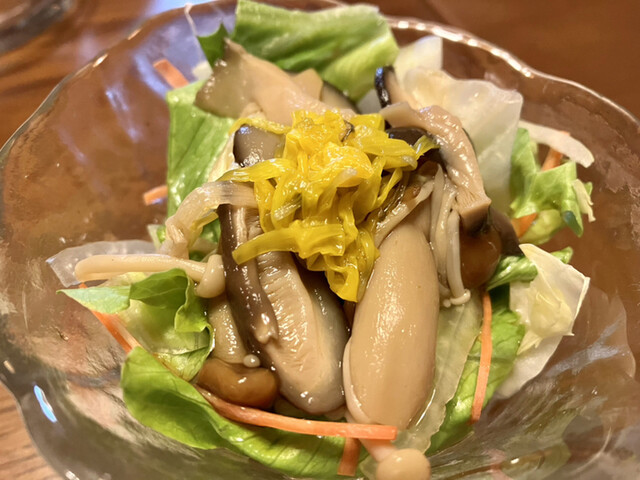 サラダはきのこなど季節の野菜ですが、少しみりんを加えているのでしょうか、少し甘口の和風ドレが美味しく、全体をまとめてくれます。