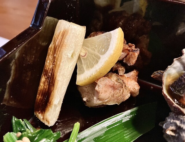 ◎「焼鳥」少量ですが、焼き目がいい感じです。鶏ももの表面はしっかり、中はふわっで、噛むと肉の脂が口の中に広がります。ギュッとお汁も出てくる脇役のネギも美味しく、備長炭を使った焼き方のうまさがわかります。ネギと一緒に食べるのが"○"です。