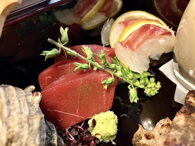 ◎「鮪と鯛のお造り」鮪はきれいな色な中トロ。脂が乗っており、さっぱりとしたつまと一緒に食べると、とても美味しい!。鯛はレモンを間に仕立てられており、もっちりとした旨みとさっぱりした香りでとても美味しくいただきました。