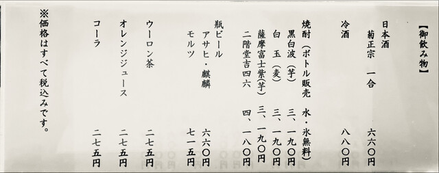 17時に到着、暖簾をくぐると、大将が迎えてくれました。コワモテに見えますが人情味があり意外と話好きです。本人曰く「気力が劣ってきてなぁ」とも言ってましたが、肌ツヤも良くて元気そうです。