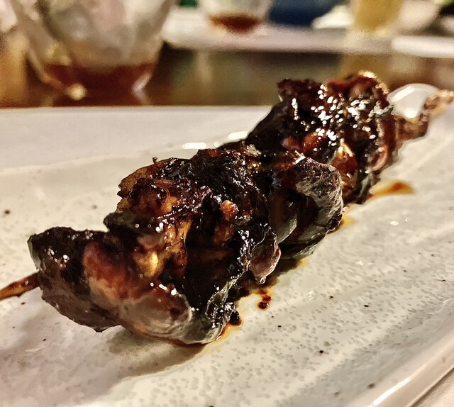 ◎「焼鶏」いつもの前菜であれば少量ですが、今回は串での提供。相変わらず、焼き目がいい感じです。鶏ももの表面はしっかり、中はふわっで、噛むと肉の脂が口の中に広がります。