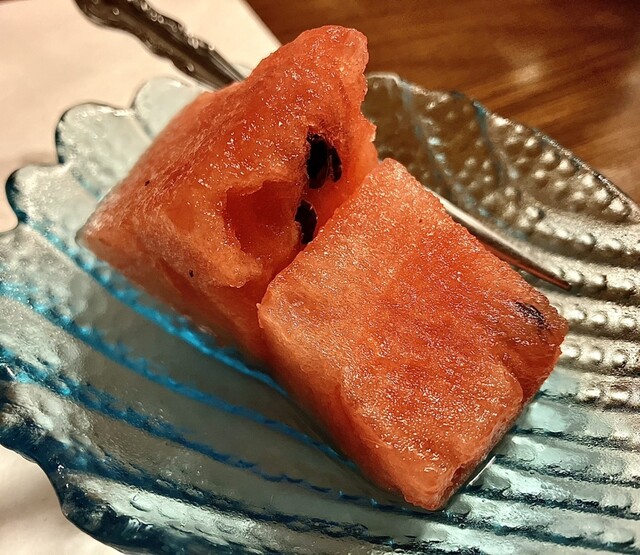 今回の水菓子は梨でした。酸味は控えめで、果汁はたっぷりでしたので、幸水でしょうか。フレッシュで甘みもあり、見た目も涼しげで季節感のある美味しさを楽しむことができました。
