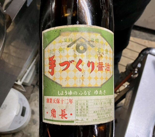 大将曰く④、特徴のあるタレの醤油は、鰻と同じ三重県から取り寄せているそう。しょうゆ発祥の地 である湯浅の手づくり醤油「湯浅醤油の角長」だそうです。実物を見せてもらいましたが、たまり醤油のようで、味醂や砂糖も使用されており、これがあのタレの味を形成しているんだなと理解できました。