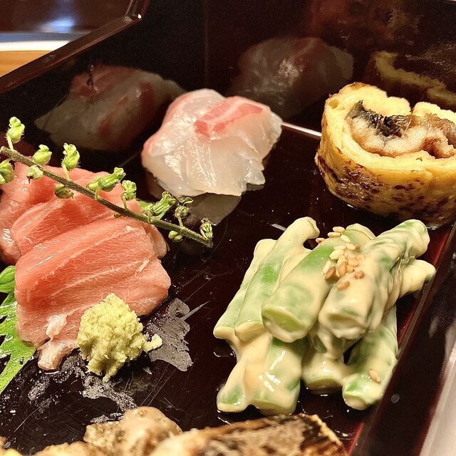 ☆「前菜(税抜¥2,000)×6」前菜はお任せで、一つの重箱にその時々のおつまみを色々少しずつ用意してくれ、時節を感じ取ることもできます。この日の前菜は茶碗蒸しの代わりに、う巻きでした。茶碗蒸しも美味しいのですが、う巻きは嬉しい…。
